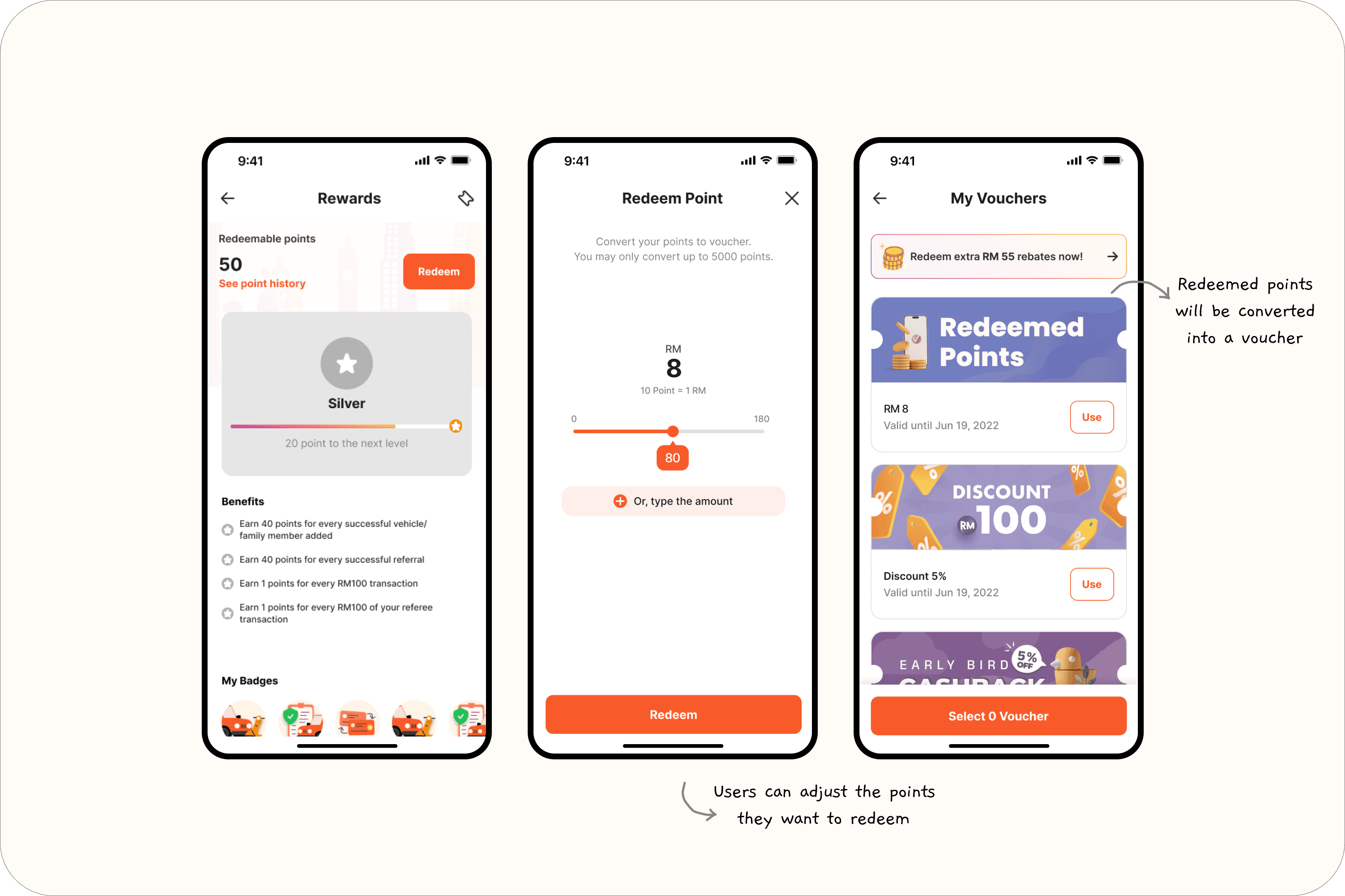 Designed rewards dashboard UI and voucher flow
