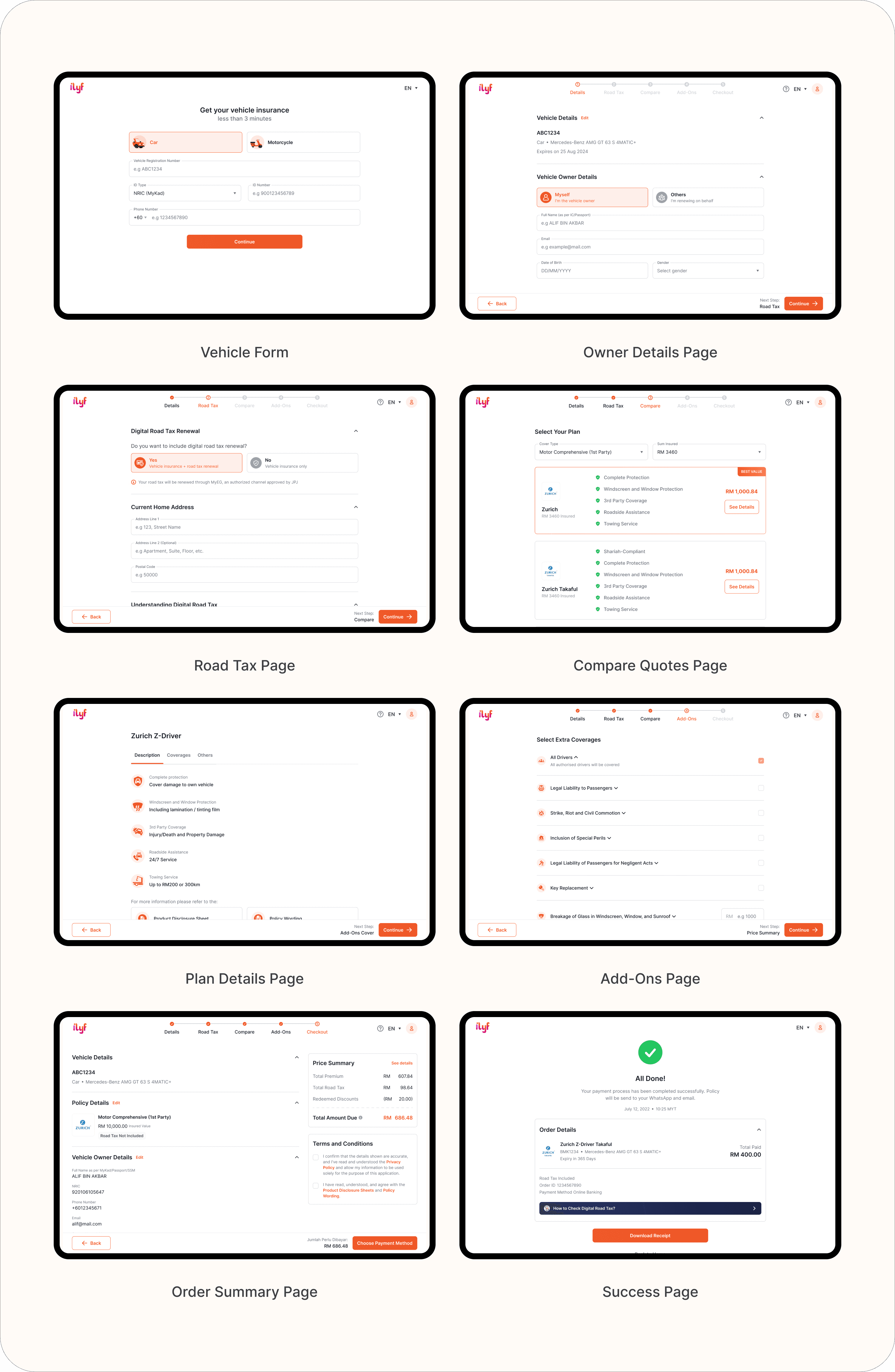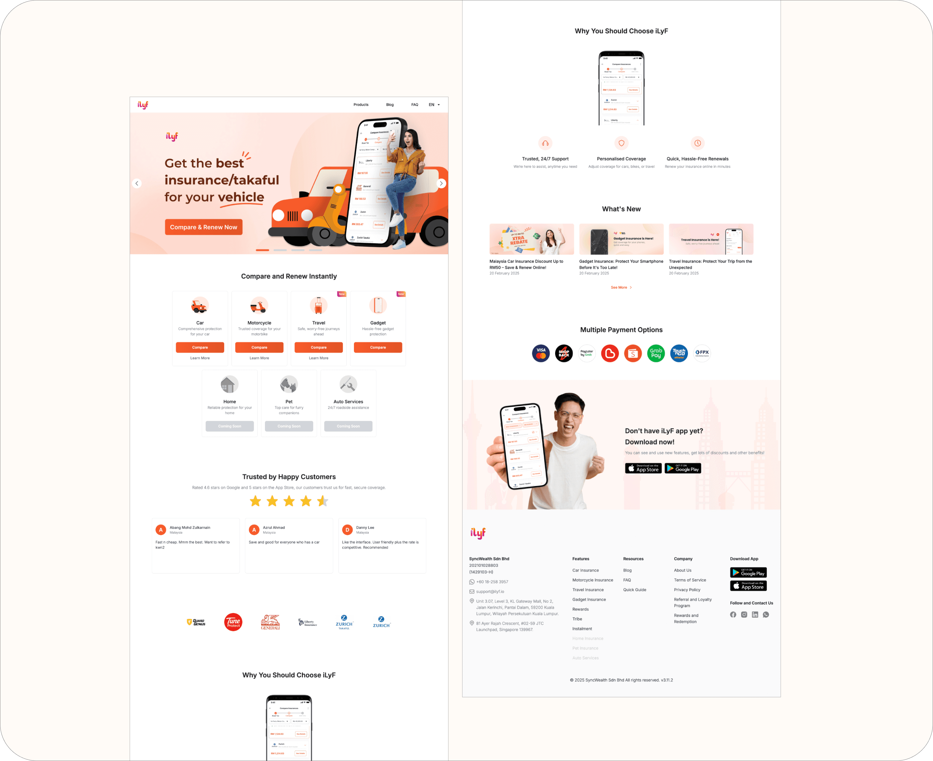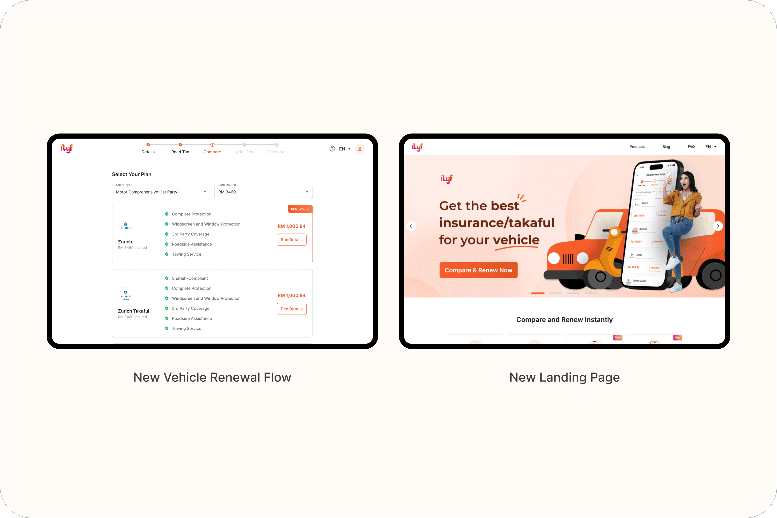 The iLyF vehicle insurance web renewal flow had served users well, but as we moved toward a more unified, mobile-first experience, it became clear that updates were needed to ensure consistency across platforms. While the existing pages were informative, their static structure didn’t fully support responsive behavior or effectively highlight key benefits, especially on smaller screens. In this redesign, I collaborated with the team to restructure the flow and apply iLyF’s updated UI system (v2), aiming to improve clarity, consistency, and usability across devices.