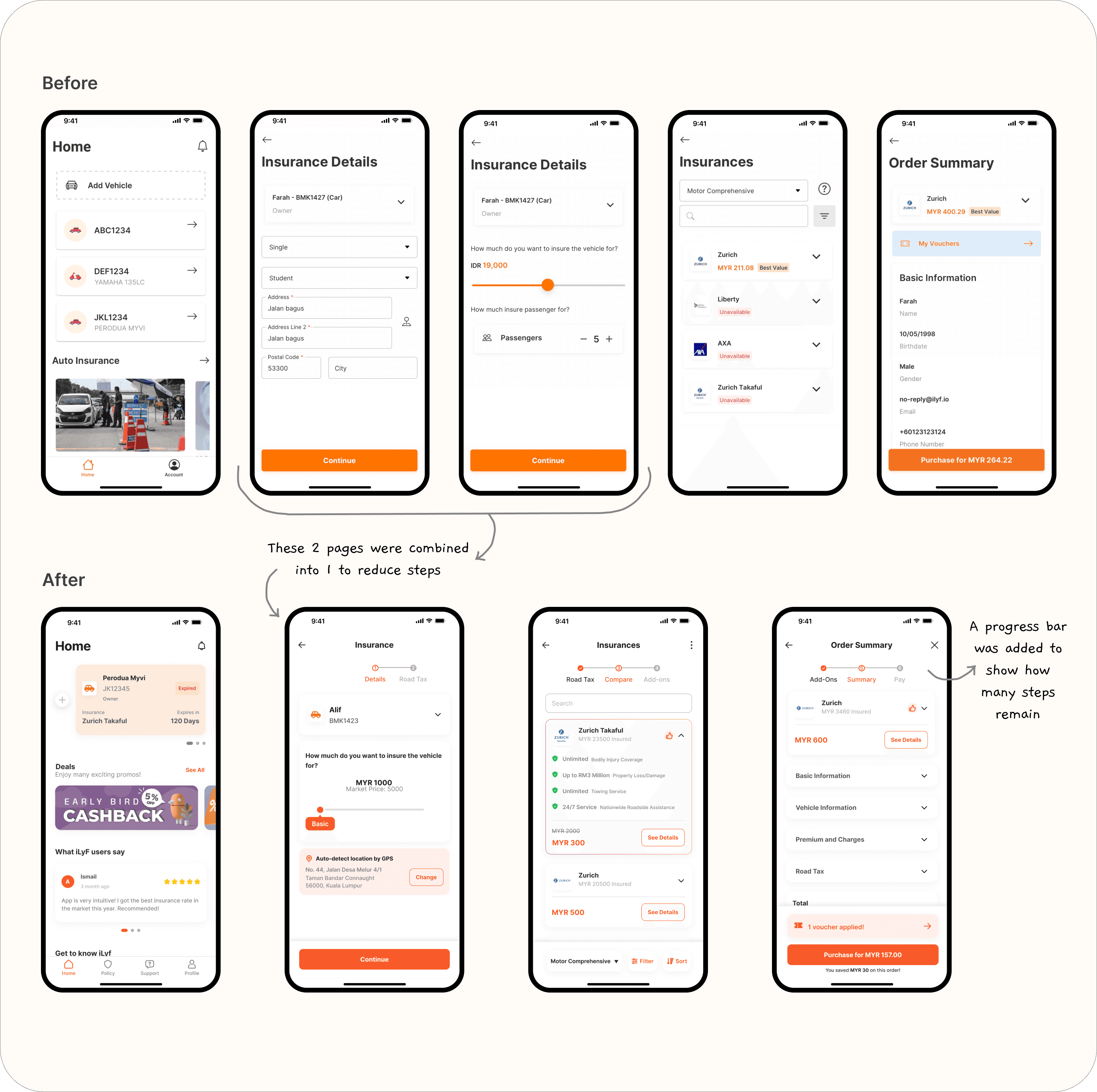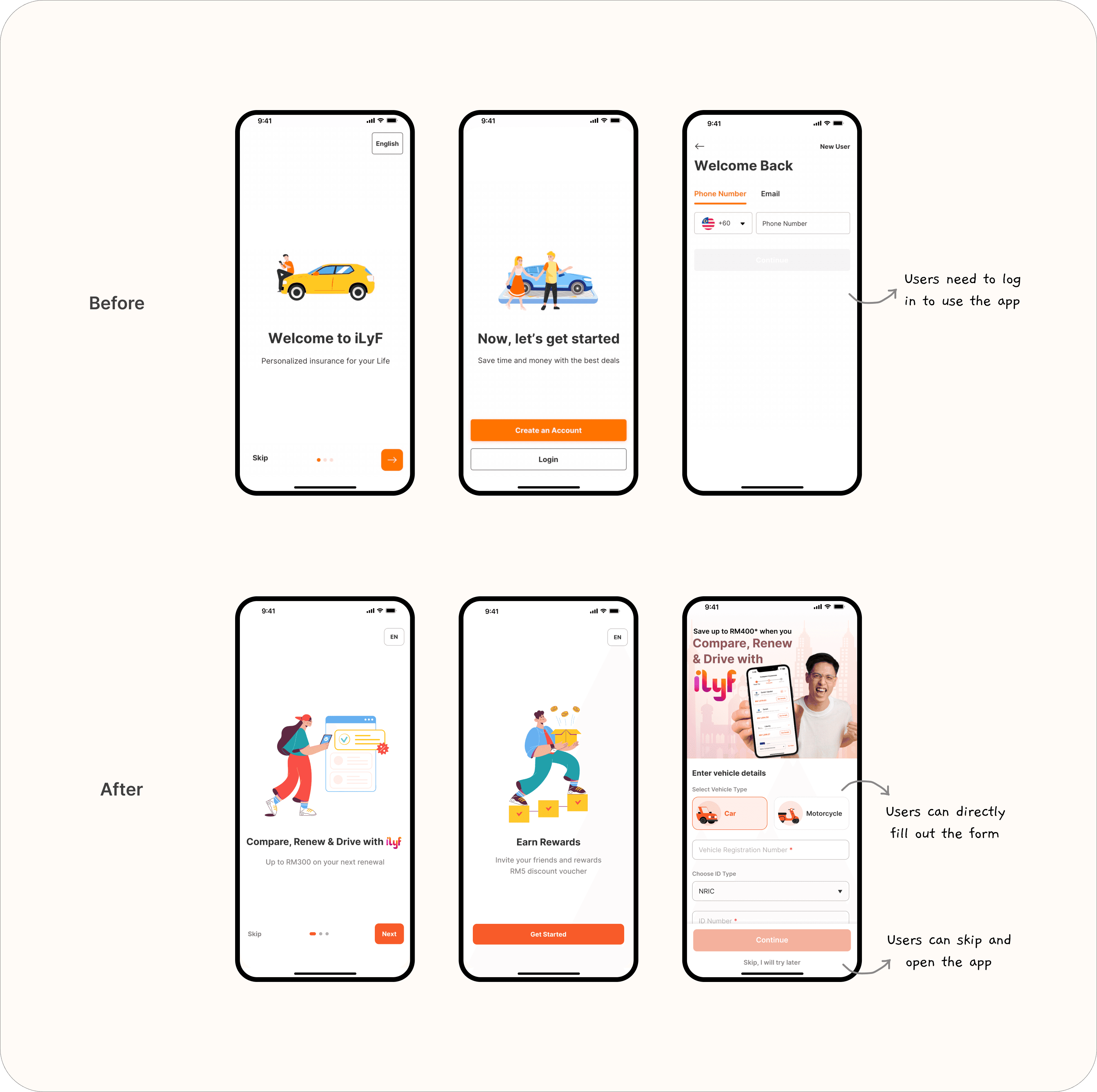 After: Reversed the flow, users now start by entering vehicle info to check their insurance status. They only need to sign in after that. Also combined sign-up/login into a single phone number verification page to simplify the flow.
