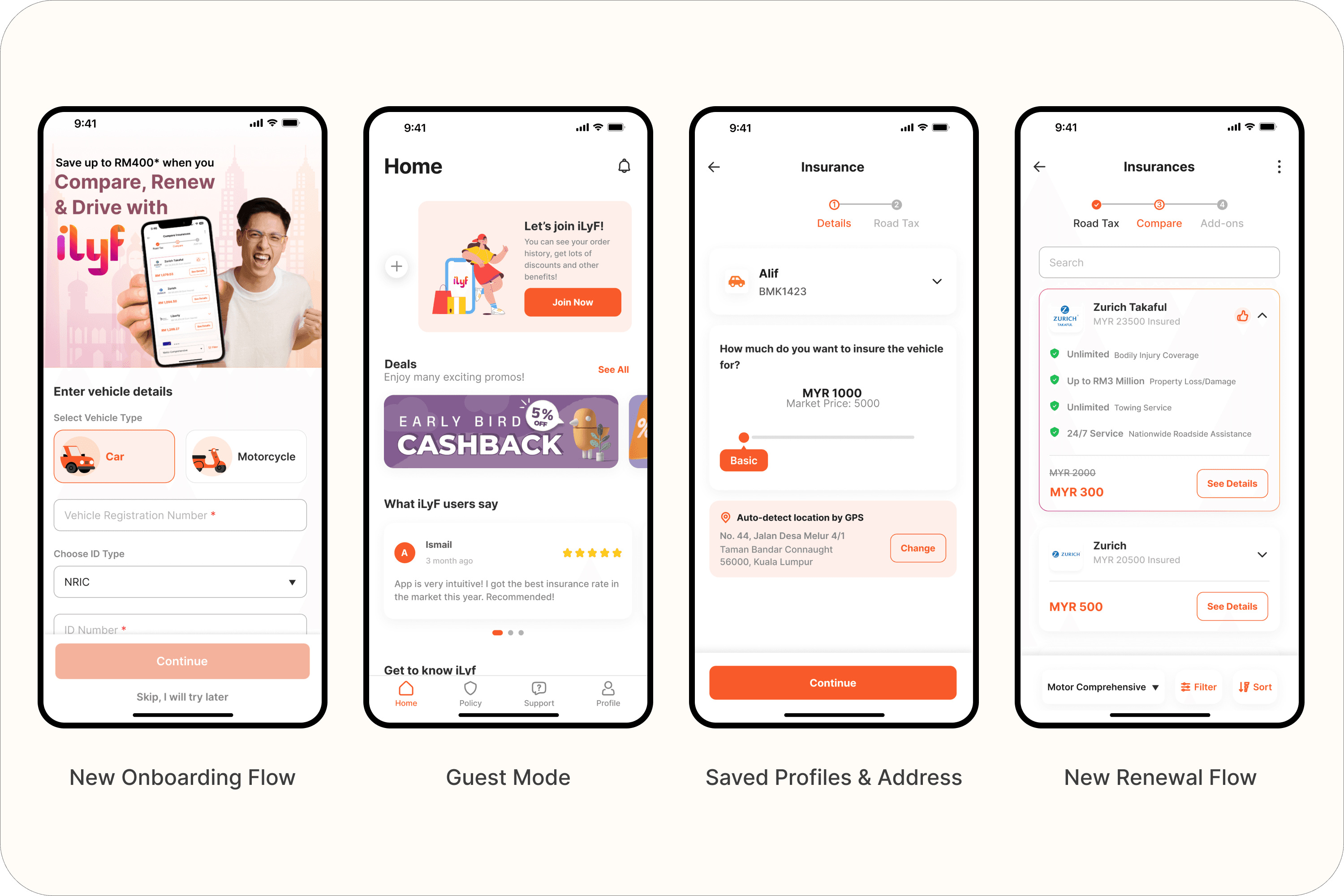 iLyF is a mobile-first insurance app that helps users manage vehicle and travel policies. It was originally built as a form-heavy experience. For v2, we aimed to simplify how users onboard, renew, and reuse their data.