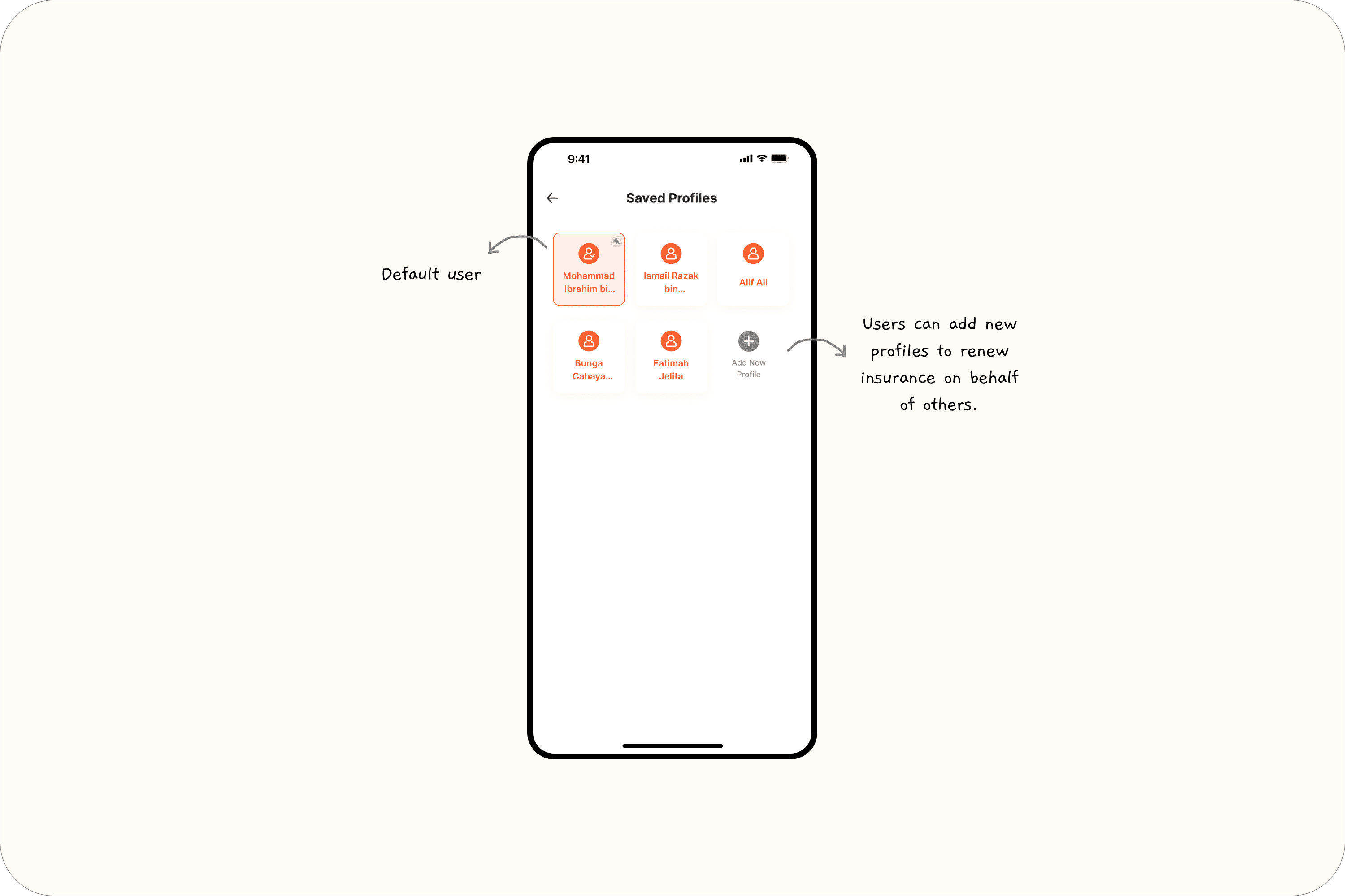 Previously, users were tied to one identity — even when renewing insurance for someone else. We added the ability to store multiple user profiles (e.g., dad, sibling), so the account owner could switch without altering their own identity.